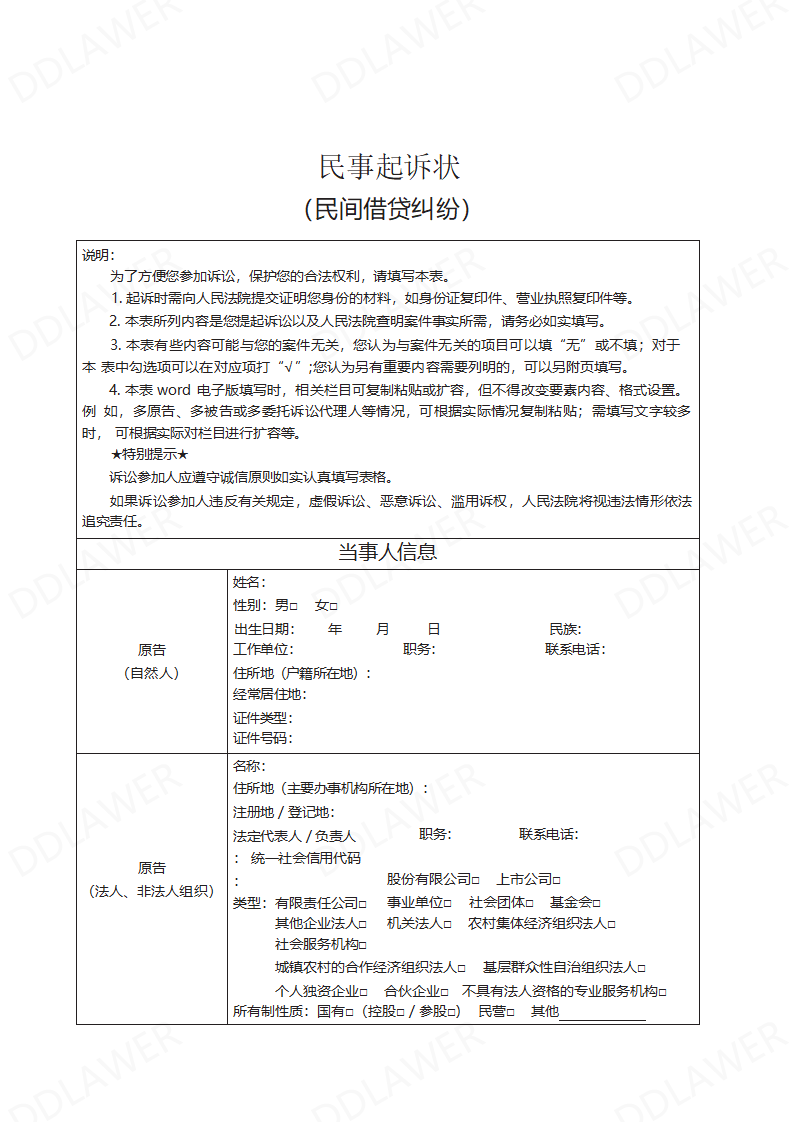 民间借贷纠纷起诉状(要素式模板)