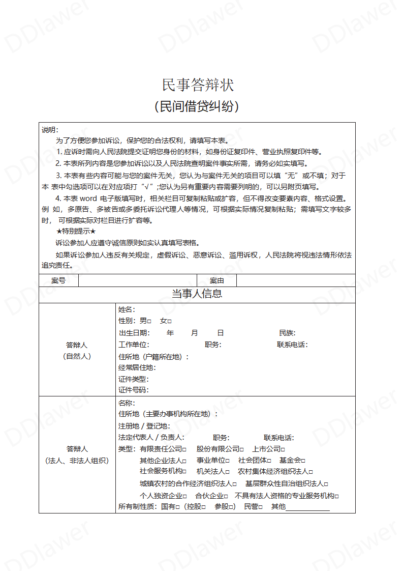 民间借贷纠纷答辩状(要素式模板)